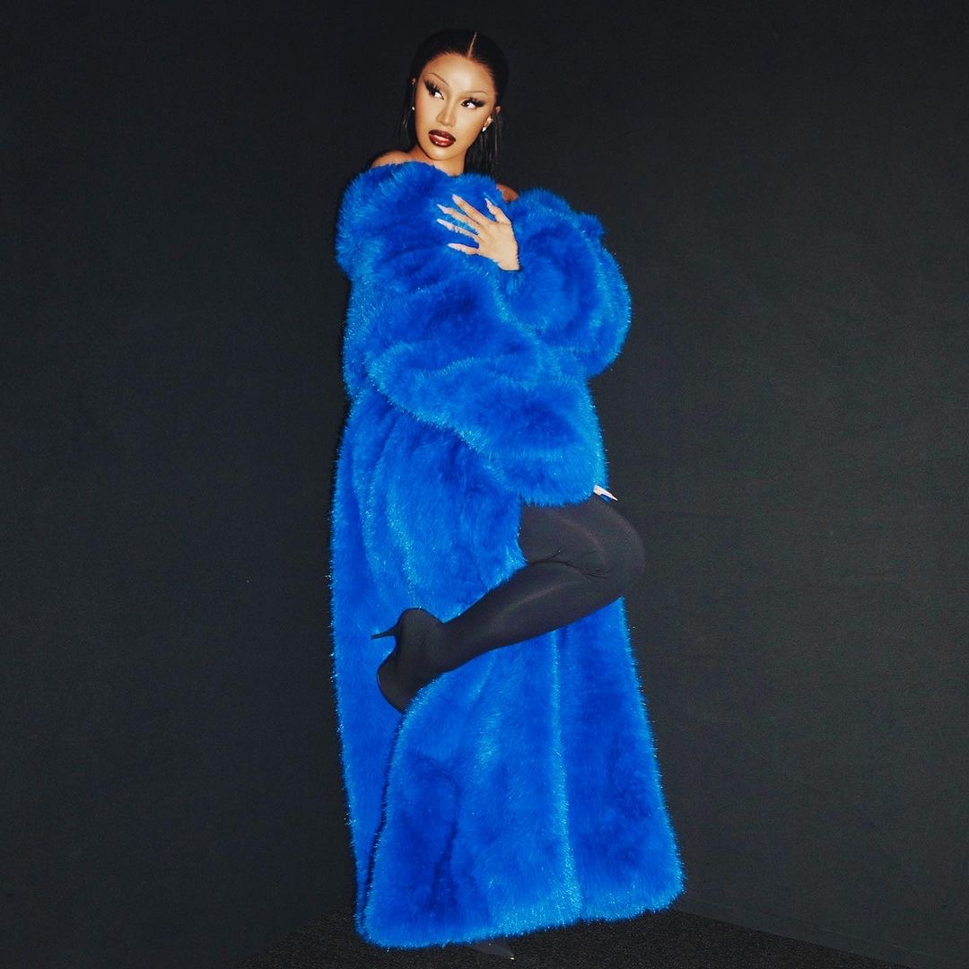 From Cardi B’s bomb voluminous coat, and Balenciaga accessories, to her dramatic glam, and slick pony tail, this look felt forward and unprecedented for Cardi, and we were so here for this fashion moment!