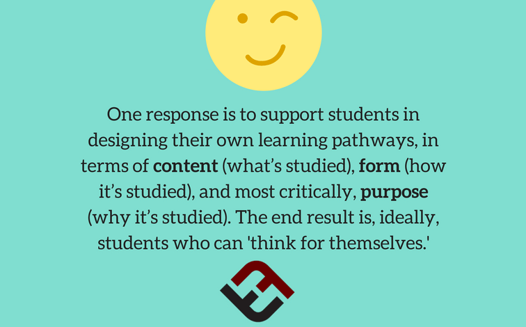 One response is to support students in designing their own learning pathways, in terms of content (what’s studied), form (how it’s studied), and most critically, purpose (why it’s studied). The end result is, ideally, students who can ‘think for themselves.’
