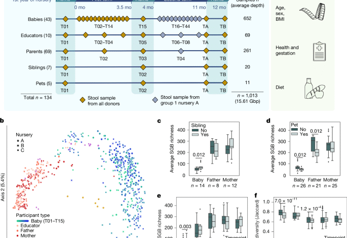 A total of 134 volunteers comprising babies (4–15 months old at nursery start, median 10 months, 18 male, 25 female) about to attend the first year of nursery school, their parents (29–50 years old, median 36 years old, 30 male, 39 female), siblings (2–21 years old, median 2 years old, 3 male, 4 female) and house pets (n = 5, 2 cats and 3 dogs), and educators (34–56 years old, median 38.5 years old, 10 female) were recruited and enroled across 3 nursery schools (here identified as A, B and C), each with 2 distinct classes, in the municipality of Trento (Italy) in June 2022. The classes within the same nursery shared few activities (that is, baby drop-off and pick-up) and spaces throughout the day, and were followed by different educators. The protocol of this study was approved by the Ethics Committee of the University of Trento (protocol number 2022-040) and by the Ethics Panel of the European Research Council Executive Agency after evaluation of the project (microTOUCH Grant agreement ID 101045015). Upon enrolment, volunteers were asked to provide informed consent and complete metadata questionnaires. Consent for participation of babies was obtained directly from parents.